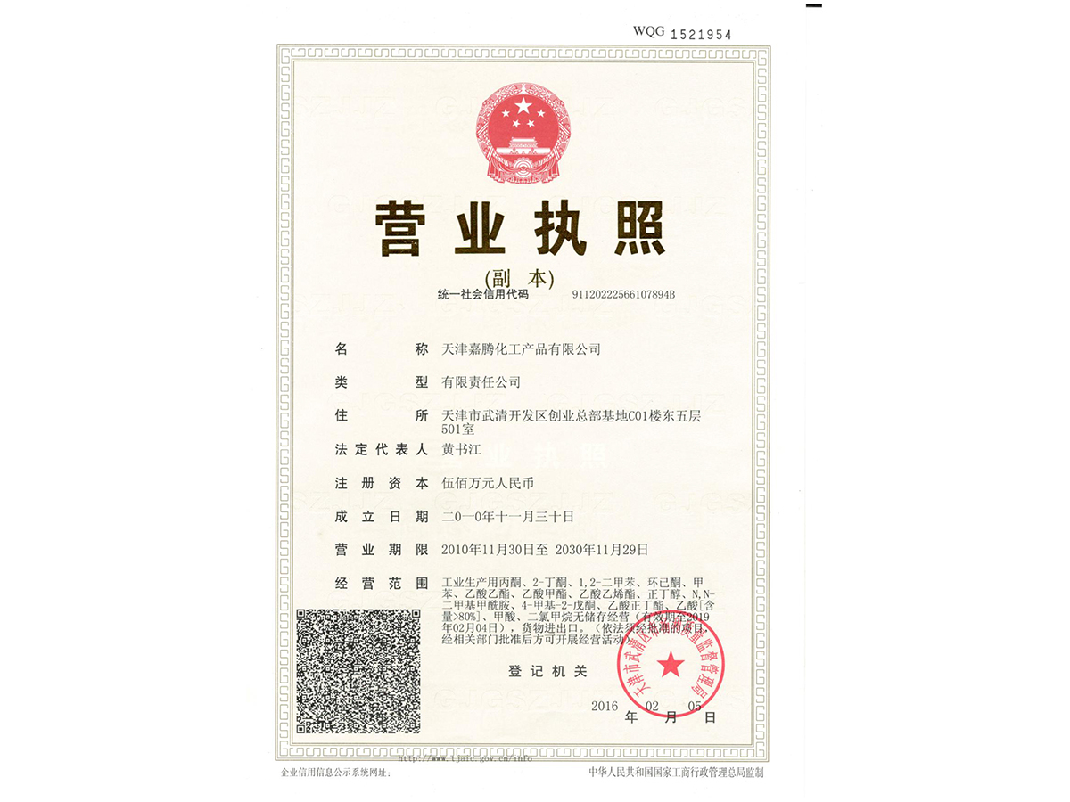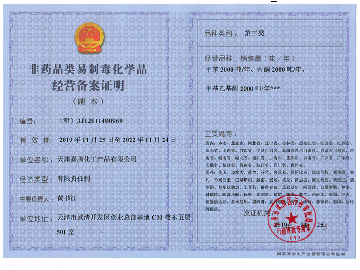Productos químicos Co., Ltd de Tianjin Jiateng registrado con 5 millones de yuan. Es una empresa química comprensiva con las derechas independientes de la importación y de la exportación, perenne dedicadas a cetona de etilo metílica (MEK), a la cetona isobutílica metílica (MIBK), a la acetona (DMK) así como otros productos químicos y a la importación de las materias primas y al comercio de la exportación relacionados. En China del norte, China del noroeste, China de nordeste, China oriental, la compañía ha establecido y mercado interior perfeccionado como el sistema de comercialización principal. Los productos de la compañía se exportan a Norteamérica, a Suramérica, a África, a Europa, a Asia Sur-Oriental y a otras docenas de países.