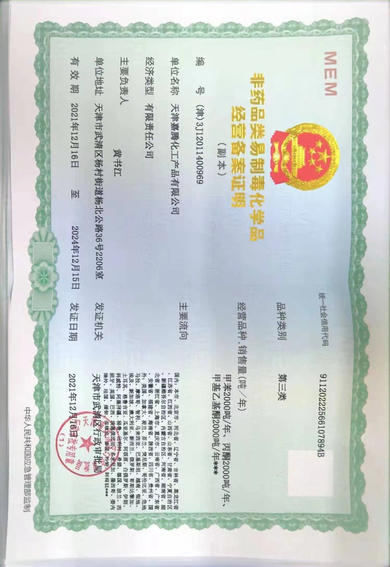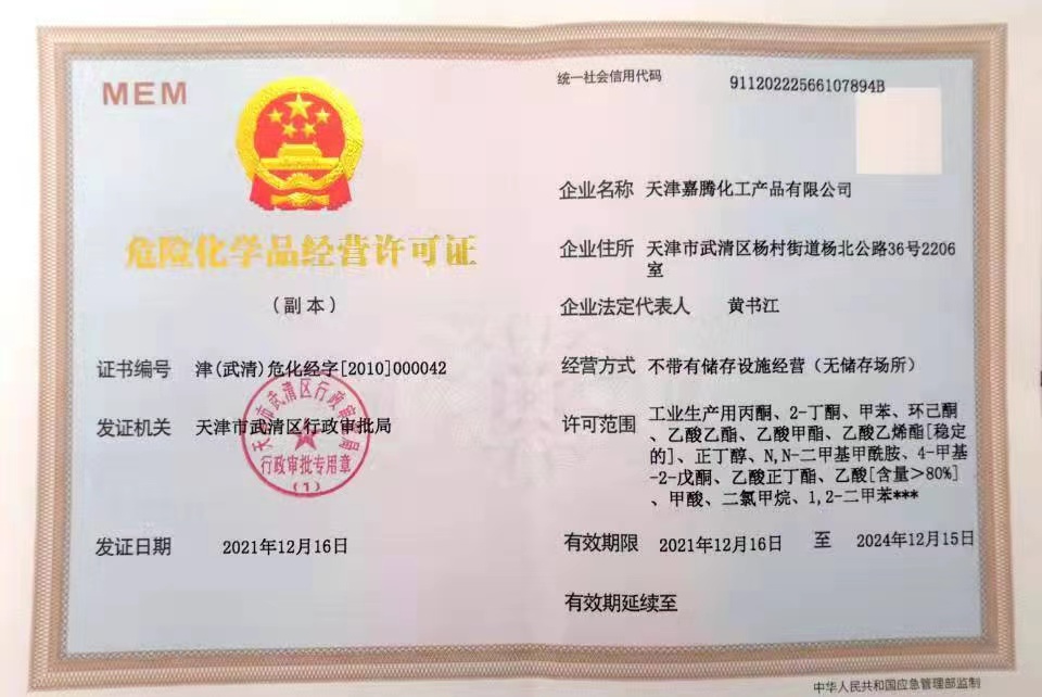 Tianjin Jiateng Chemical Products Co.,Ltd registered with 5 million yuan. Is a comprehensive chemical enterprise with independent import and export rights, perennially engaged in Methyl Ethyl Ketone (MEK), Methyl Isobutyl Ketone (MIBK), acetone (DMK) as well as other chemical products and related raw materials import and export trade. In North China, Northwest China, Northeast China, East China, the company has established and perfected domestic market as the main marketing system. The company products are exported to North America, South America, Africa, Europe, Southeast Asia and other dozens of countries.